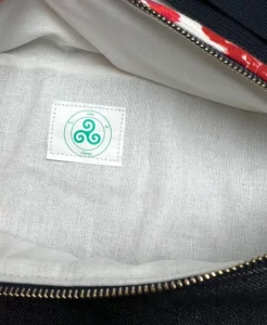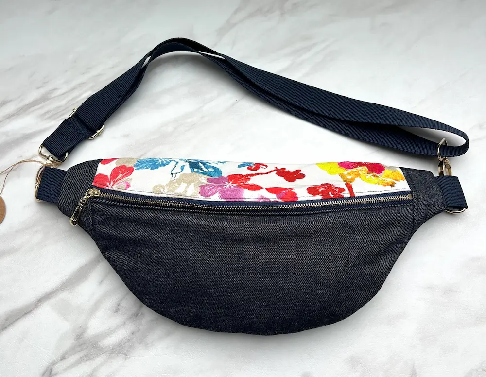 Sac banane en tissu Jean avec partie haute grande fleurs colorées.