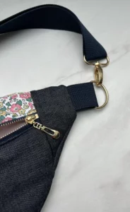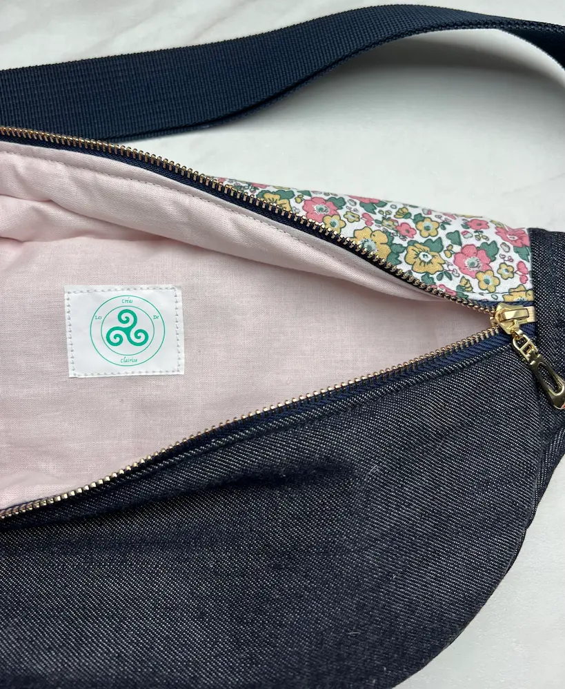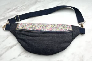 Sac banane en Jean et partie haute coton fleuri doublé molleton et coton rose pale uni.
