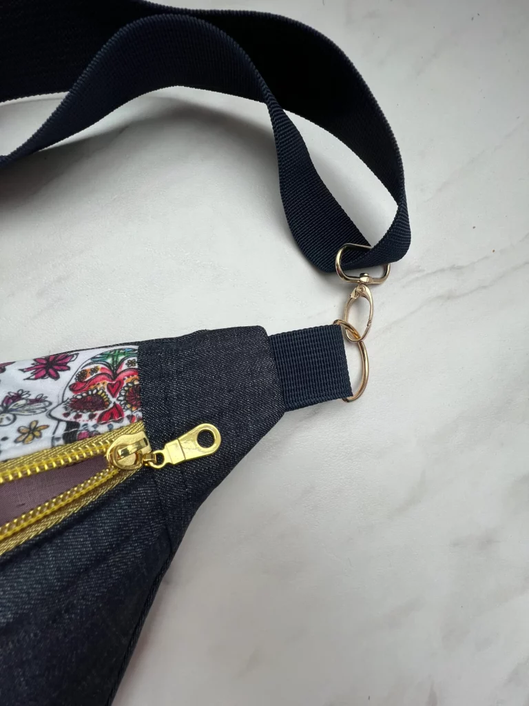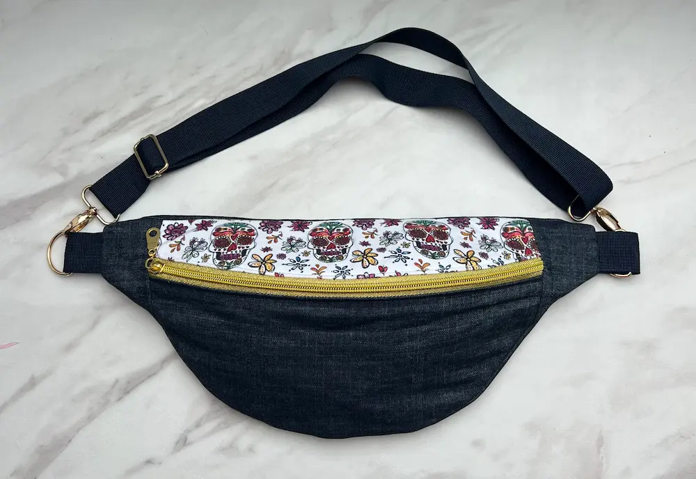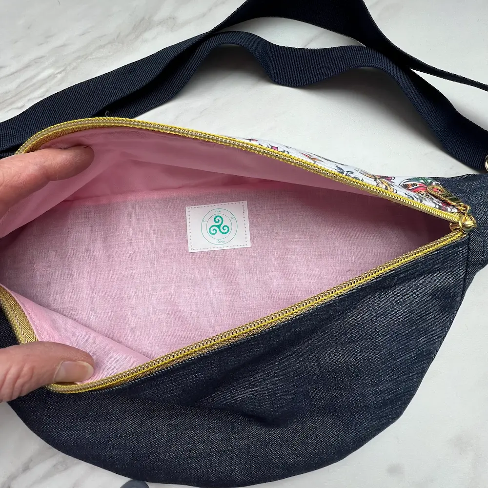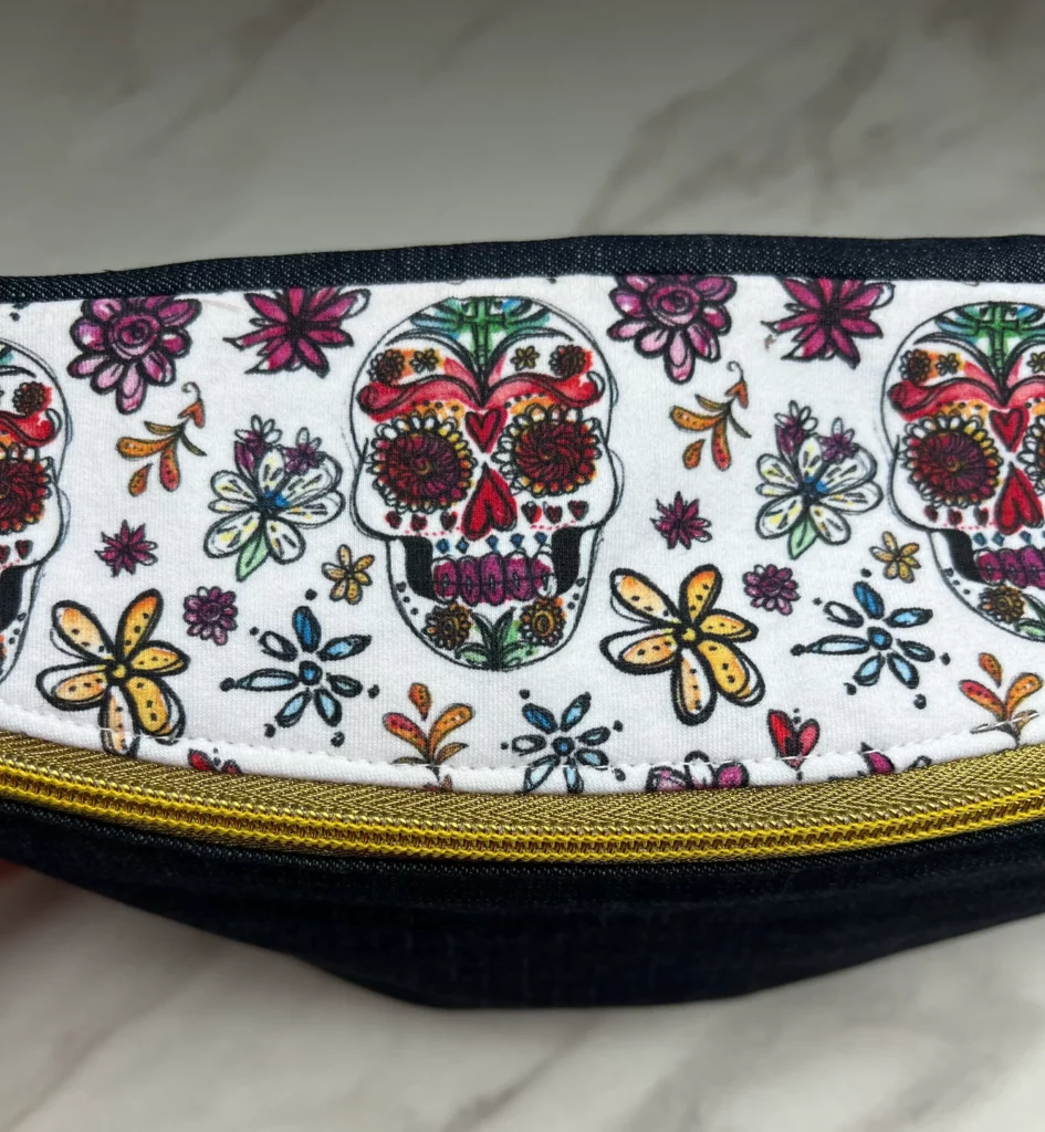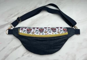 Sac banane en Jean et partie haute jersey renforcé imprimé têtes de mort et fleurs doublé coton rose uni.