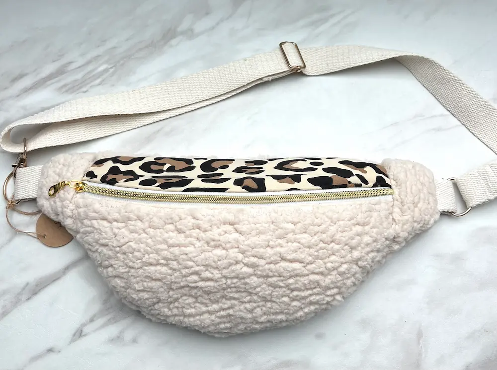 Sac Banane en moumoute écrue et partie haute léopard.
