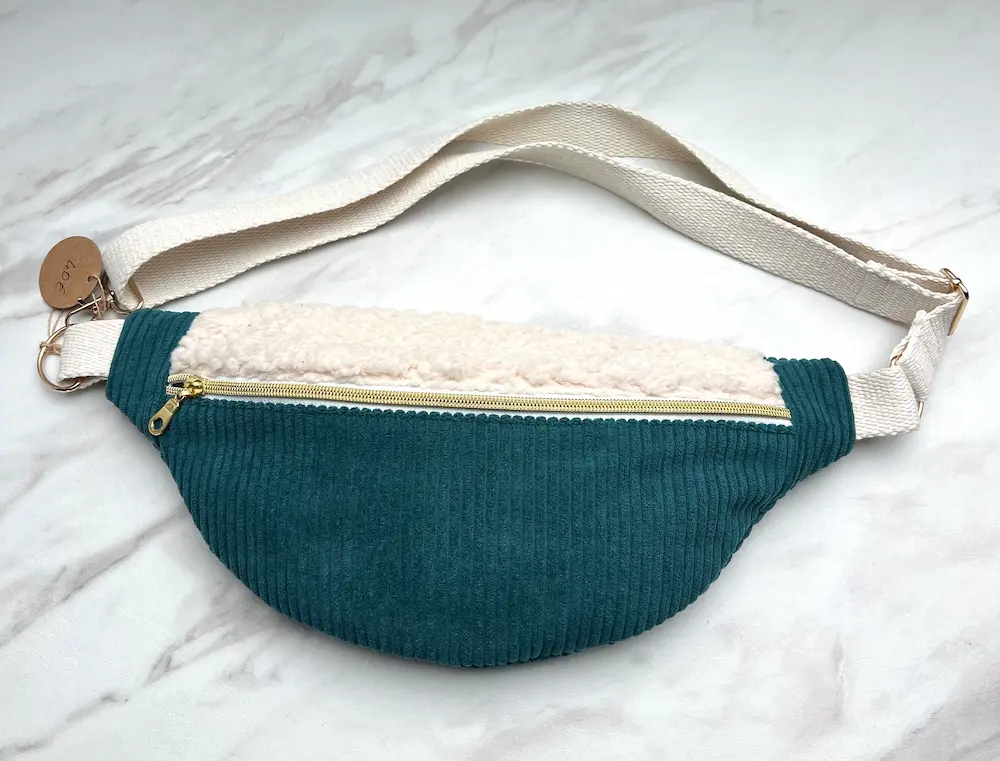 Sac Banane en velours côtelé bleu/vert avec haut moumoute écrue, doublée en coton écru avec une poche intérieure supplémentaire zippée.