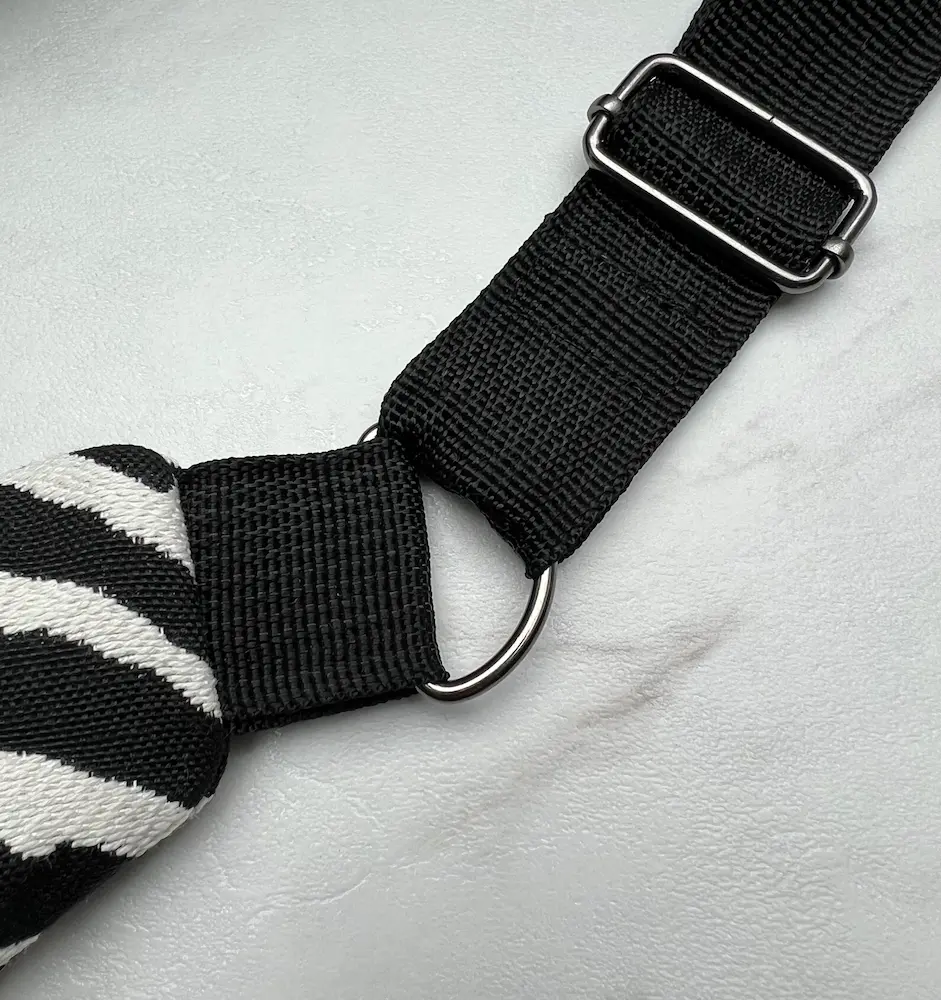 Sangle noire réglable, de 3cm de large sur environ 1m15 avec deux anneaux.